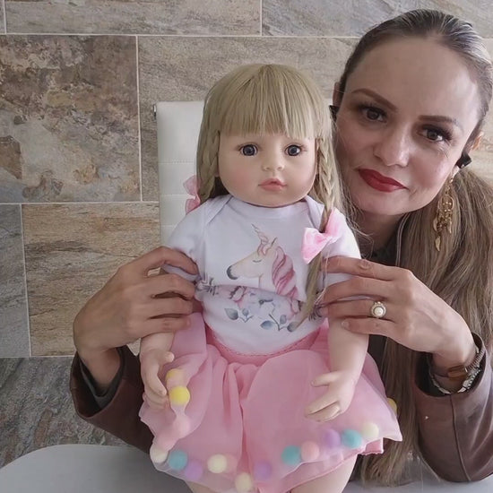 Muñeca bebé realista de vinilo 55 cm con cabello rubio y vestido rosa