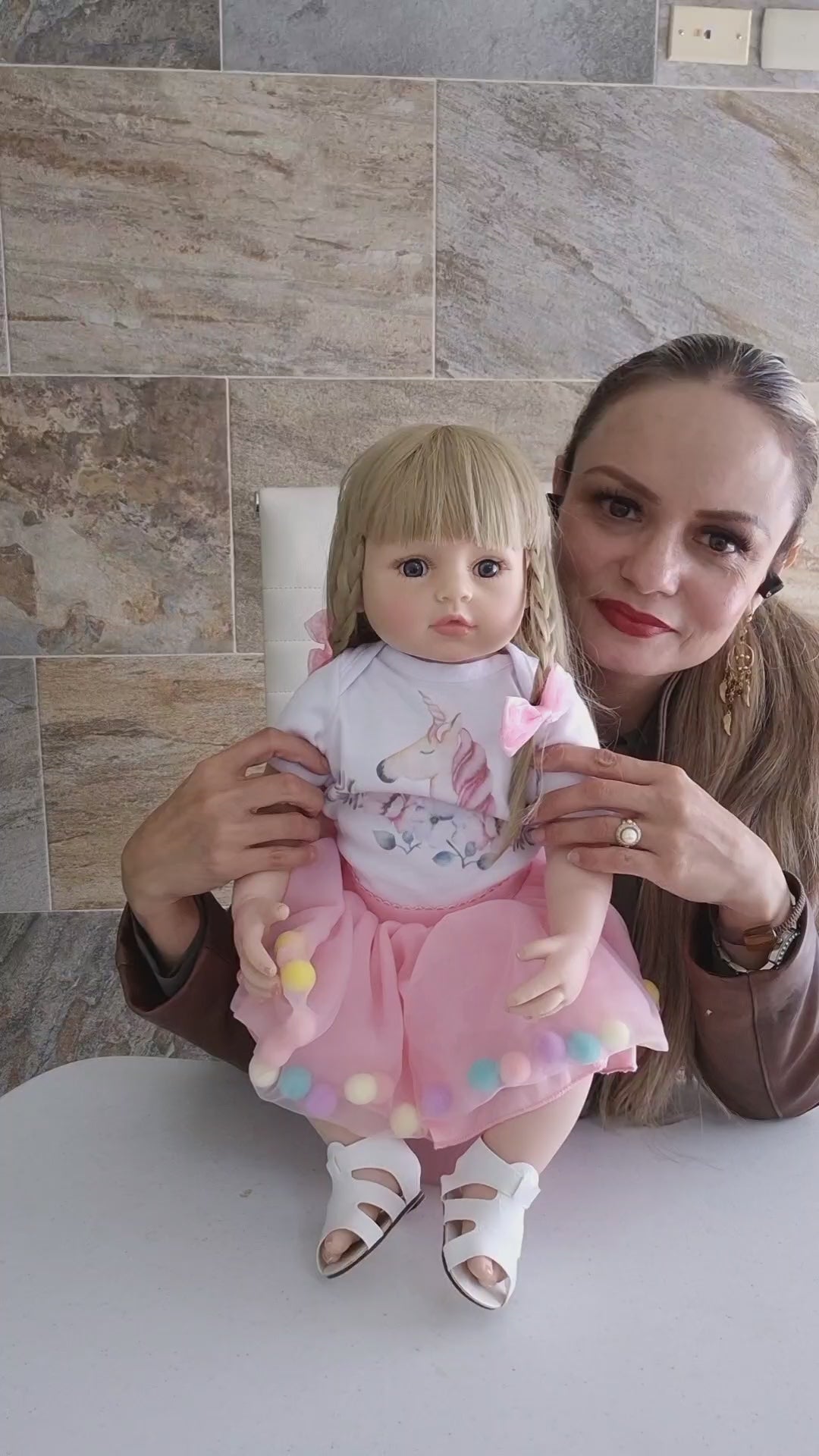 Viene con un hermoso vestido rosa con pompones, zapatitos blancos y moños en el cabello. Además, puedes cambiarle la ropa por ropa real de bebé talla 0-3 meses.