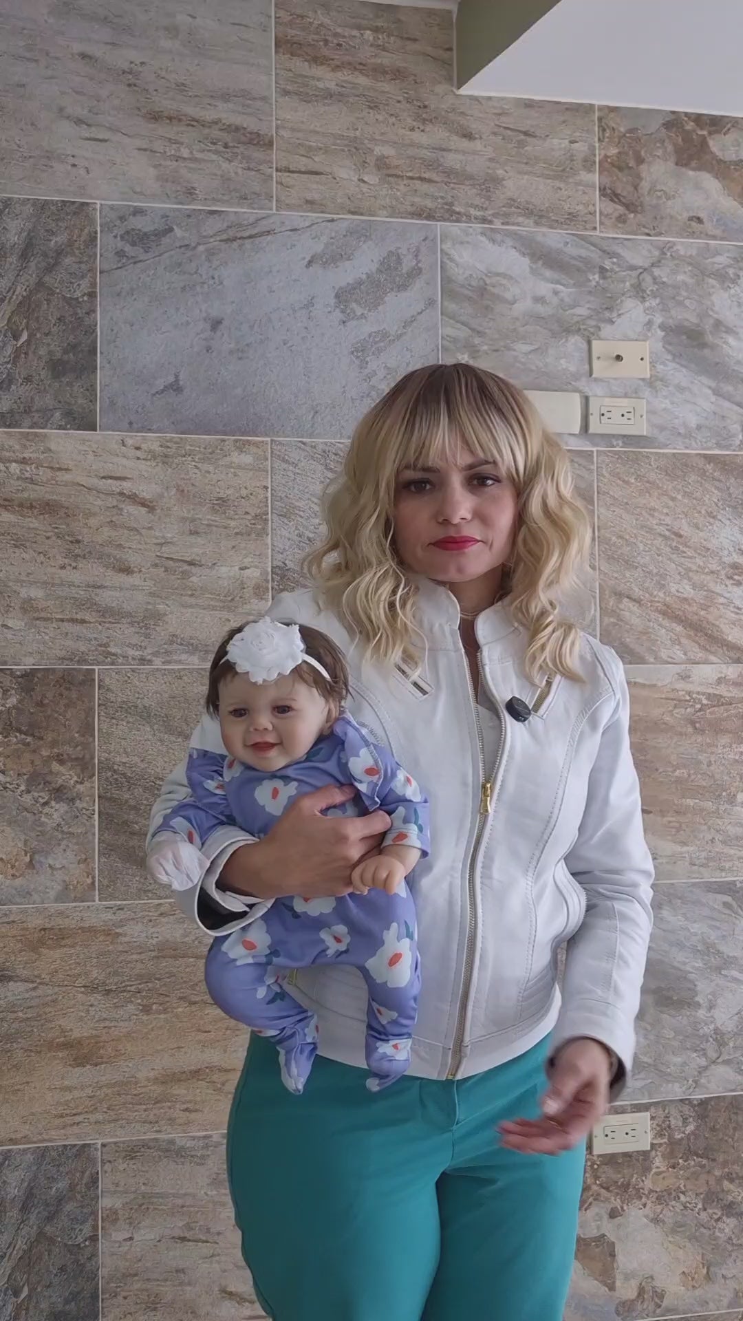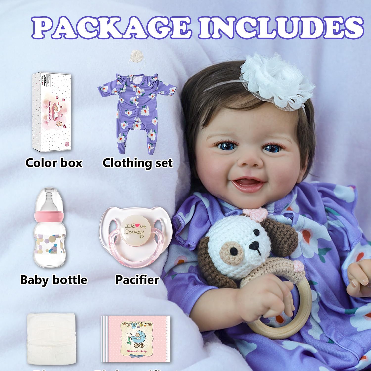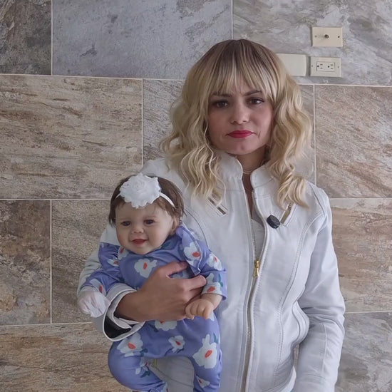 Vestida con un encantador mameluco floral morado y diadema a juego, su diseño articulable permite posiciones naturales, ideal para abrazar y jugar. Sus ojos expresivos y cabello implantado a mano aportan un aspecto auténtico que enamora a niños y coleccionistas.