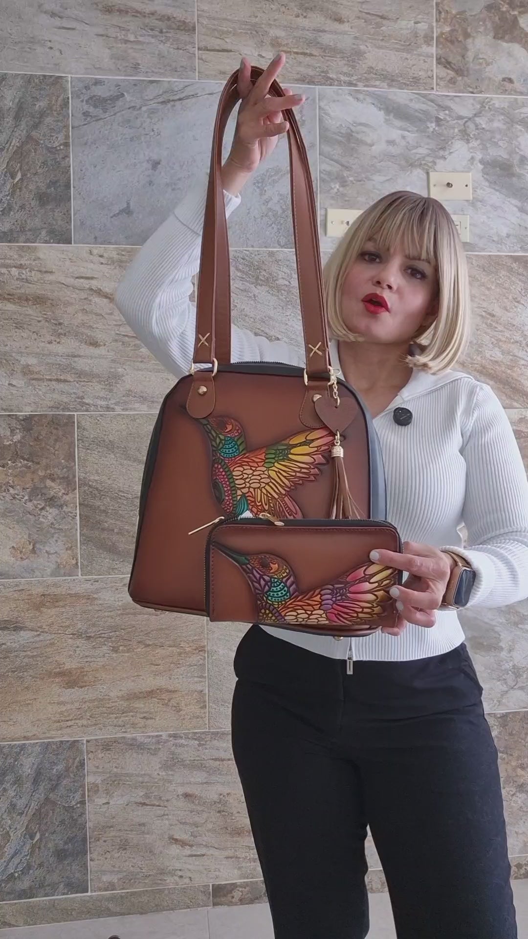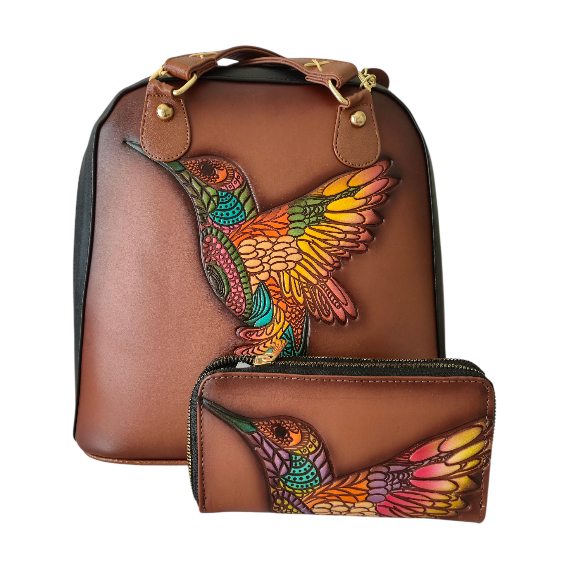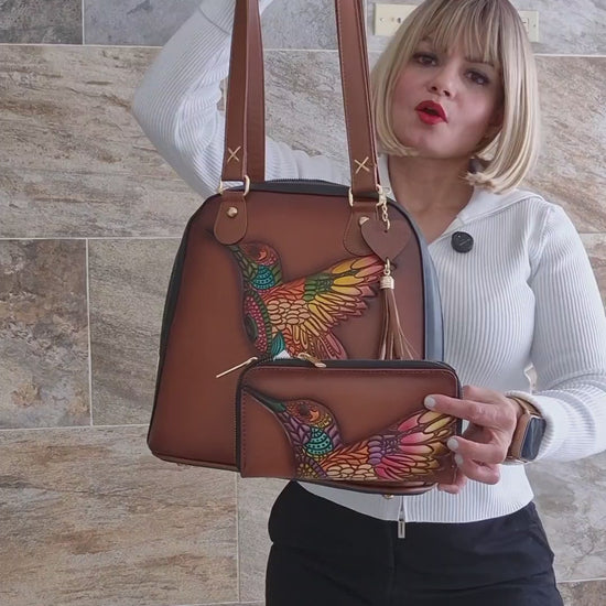 Set Artesanal de Bolsa y Mochila con Cartera | Diseño de Colibrí en Relieve