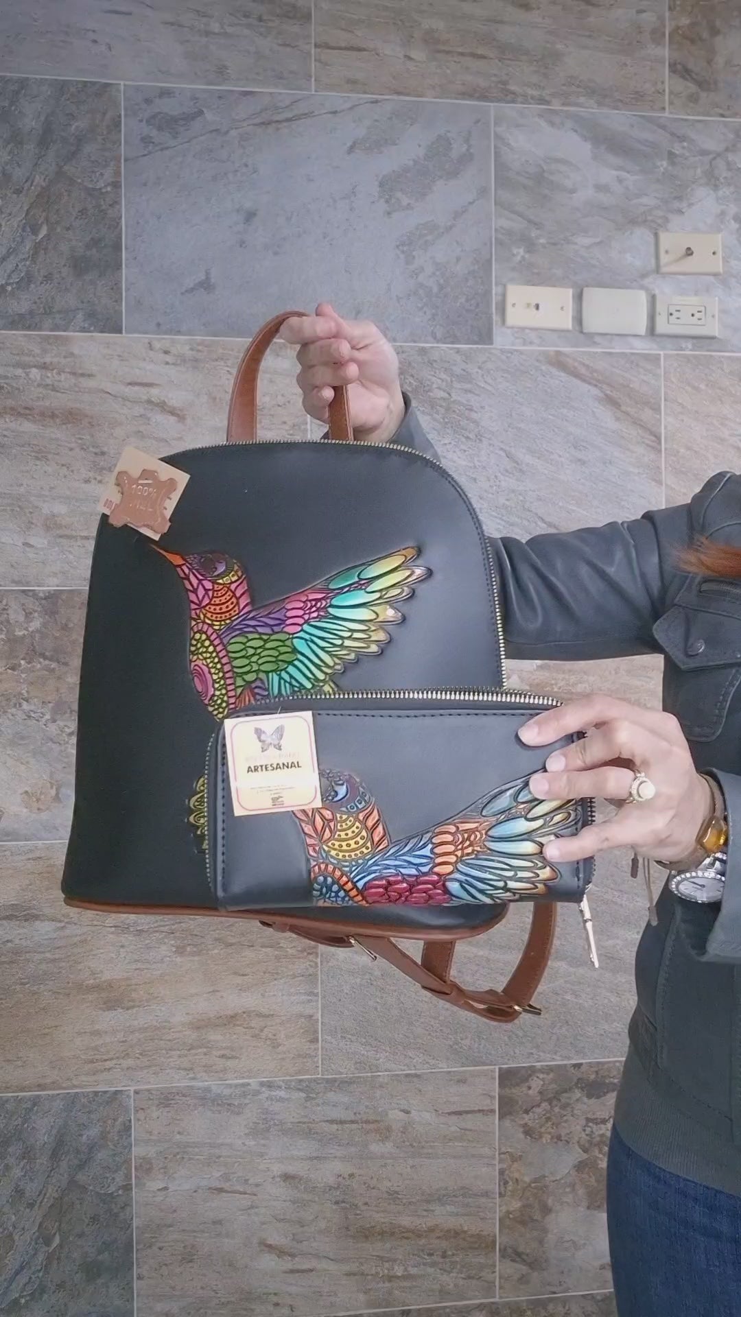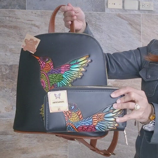 Set Artesanal Mochila y Billetera con Colibrí Multicolor | Diseño Elegante