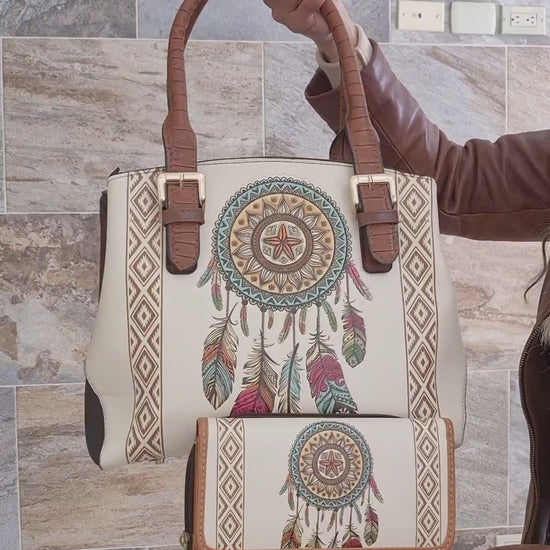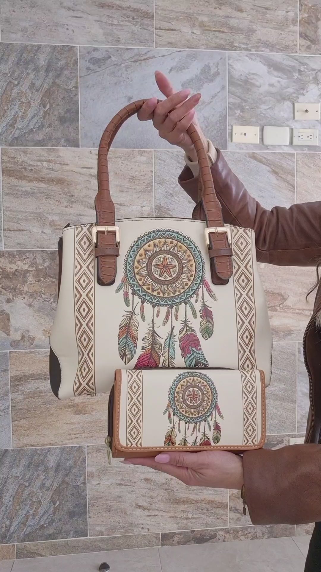 Set Artesanal de Bolsa y Billetera en Cuero Vegano con Diseño Étnico Atrapasueños